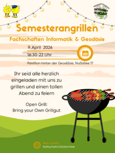 Kommt vorbei zu unserem Semesteranfangsgrillen, trefft alte Bekannte, lernt neue Leute kennen und genießt gutes Essen in entspannter Atmosphäre! 🌭🥗