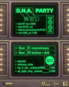 zusammen laden die Fachschften Informatik, Physik und Molekulare Biomedizin zur „D.N.A – Data Neutrons & Aminos“ Party ein.